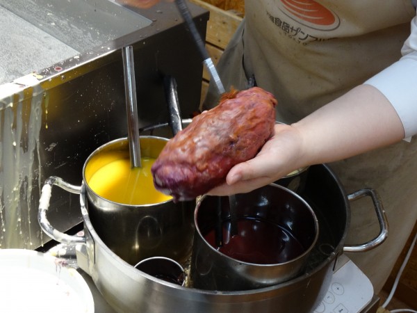 次に、焼きいもの皮の色を水面に薄く広げ、練ったいもを皮で包んでいきます。