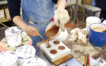 The colored parts are then arranged on a vessel. If necessary, there is secondary processing to add a sauce, or finishing work such as polishing etc.