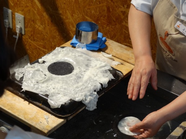 お湯の表面に餃子の皮の色の蝋を流して大きく広げシートをつくり、金型で6枚切り抜きます。