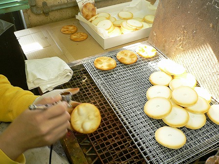 ↑ これは「塩せんべい」の焼けた感じをエアブラシで色付けしている所です、ひとつづつ手作業で焼き色を付けていきます、